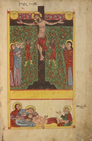 Վերջին ընթրիքից հետո Գեթսեմանիի պարտեզում հռոմեացի զինվորները ձերբակալում են Հիսուսին: Ձերբակալումից հետո Նրան ծաղրում են, չարչարում՝ դատապարտելով խաչի մահվան: Հիսուսի խաչելությամբ ու մահվամբ իրականացան հինկտակարանյան բոլոր մարգարեությունները Մեսիայի գալստյան և փրկագործական վերաբերյալ: Հիսուսի մահվան պահին արևն ու լուսինը խավարում են, Երուսաղեմի տաճարի վարագույրը պատռվում է, երկիրը շարժվում է, ժայռերը ճեղքվում են, և բացվում են գերեզմանները` ազդարարելով հին աշխարհի ու դժոխքի մոտալուտ կործանումը: Մեռած Հիսուսին խաչից իջեցնում և պատանքի մեջ փաթաթելով` դնում են վիմափոր գերեզմանի մեջ ու գերեզմանի մուտքը փակում վեմ քարով: