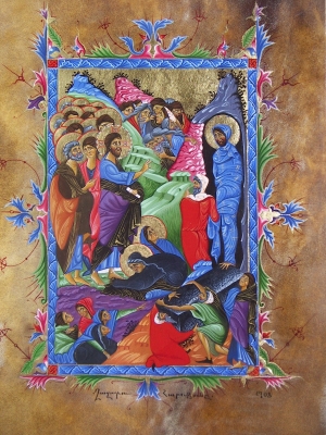Հայկական մանրանկարչությունում Ղազարոսի հարության տեսարաններից մեկում դեպի գերեզմանը գնացող Քրիստոսը մանրանկարի իմաստային կենտրոնն է: Ուսուցչին հետևում են Նրա առաքյալները, նրանցից միայն մեկը՝ Հուդան, որ պատկերված է կիսադեմ, գնում է Քրիստոսի առջևից: Կոմպոզիցիան կառուցված է շարժման վրա, որի մեջ ընդգրկված է նրա կուլմինացիոն կետը՝ Քրիստոսի ժամանումը: Քրիստոս պատկերված է գլուխը թեթևակի խոնարհած, աջ ձեռքը բարձրացրած: Ընդ որում Քրիստոսի ձեռքն այնքան երկար է, որ եթե ցած թողնի, անկասկած, կհասնի սրունքի կեսին: Ղազարոսի ազգականների ու ապականիչ հոտից քթերը պահած ծառաների դեմքերին վիշտ ու թախիծ կա: Այս զգացումը ակնհայտ է Ղազարոսի երկու քույրերի դեմքերին, որոնք Հիսուսի ոտքն են ընկել: